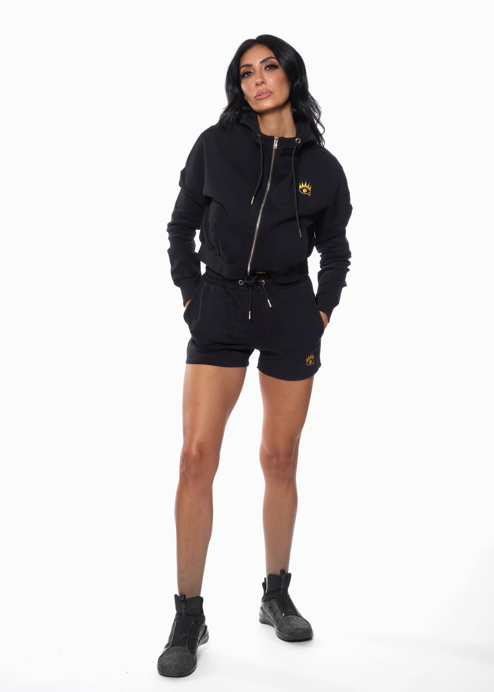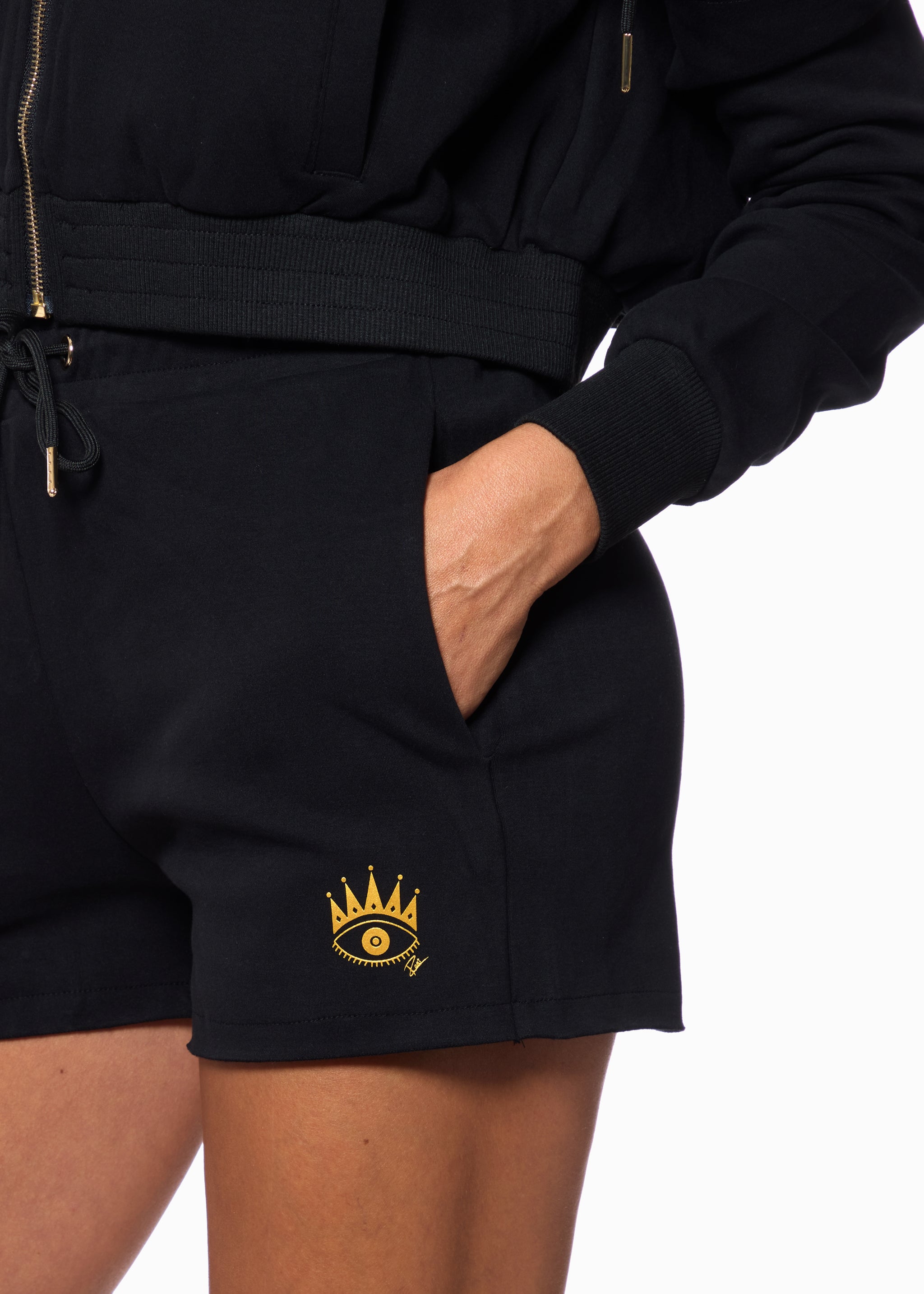 Meet the ROMi Eye Shorts, your new go-to for elevated loungewear. Designed in a buttery-soft, premium cotton blend, these shorts offer a relaxed yet refined fit with a smooth elastic waistband for all-day comfort. Gold detailing and the signature crowned evil-eye emblem bring a polished, high-fashion touch to this easy silhouette.