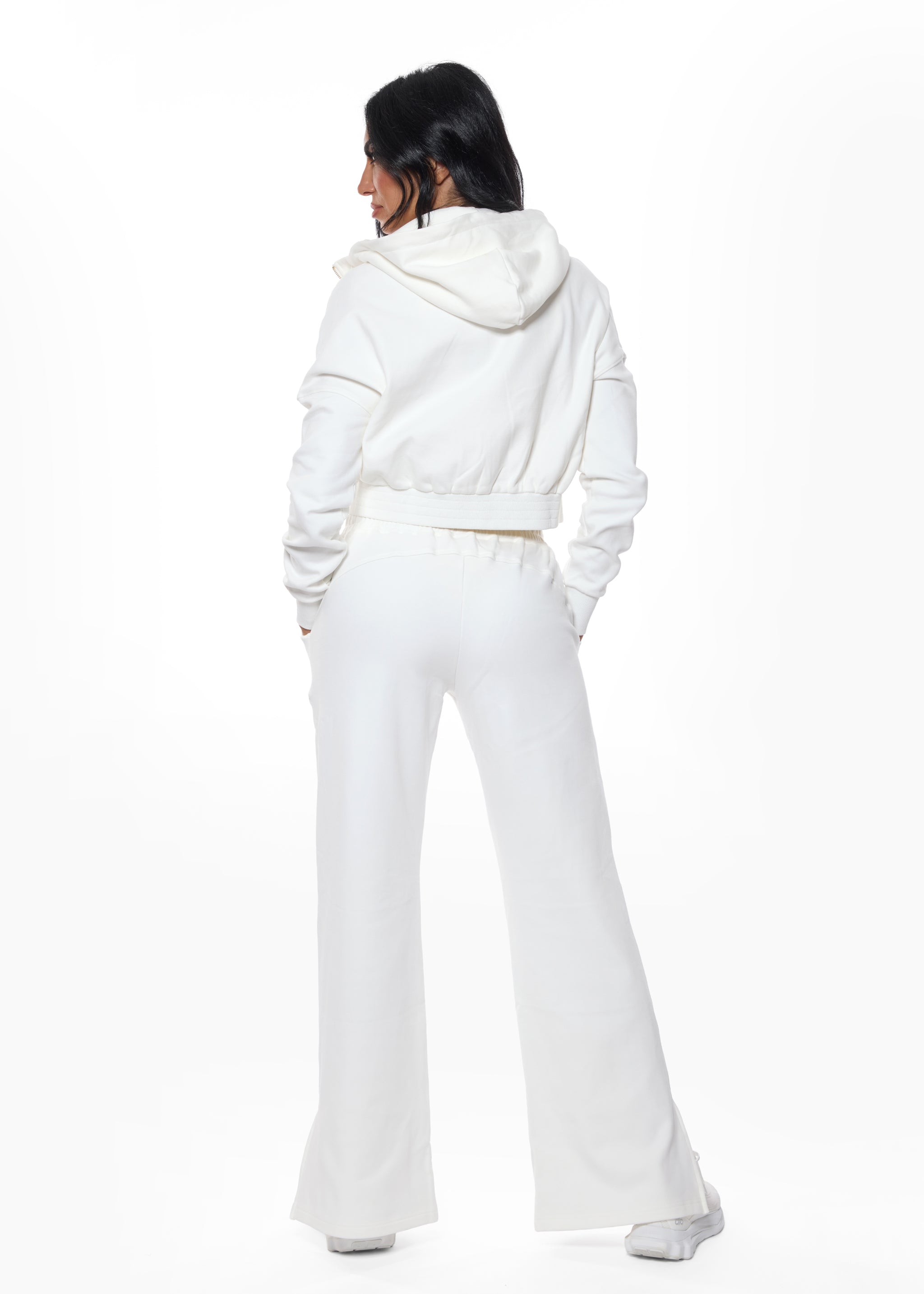 A drawstring waist with gold hardware adds a polished, adjustable finish, while the signature crowned evil-eye emblem offers a subtle touch of ROMi luxury. Perfect for travel days, relaxed chic styling, or pairing with the matching cropped hoodie for a monochrome power look.